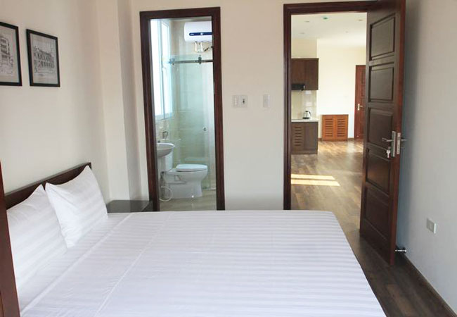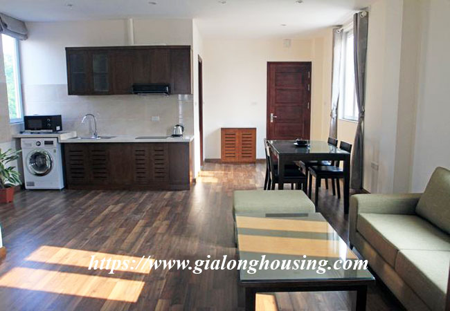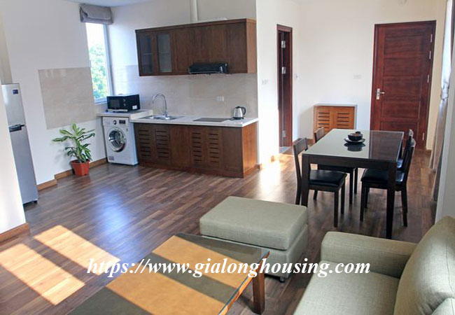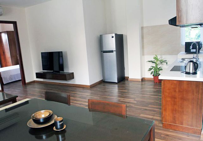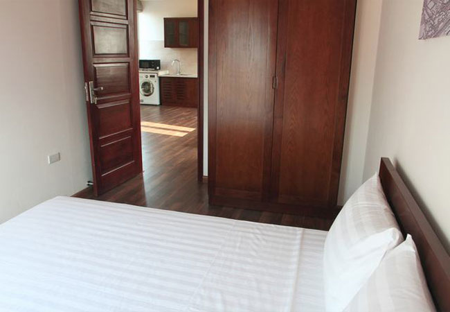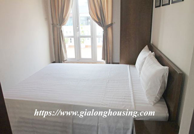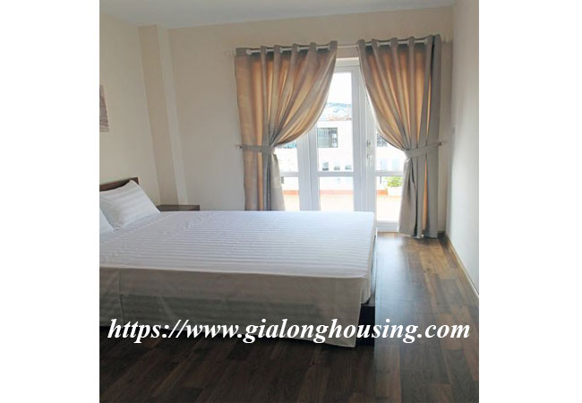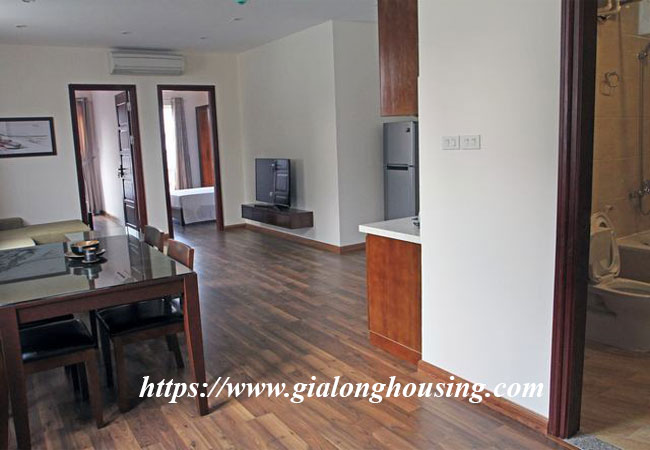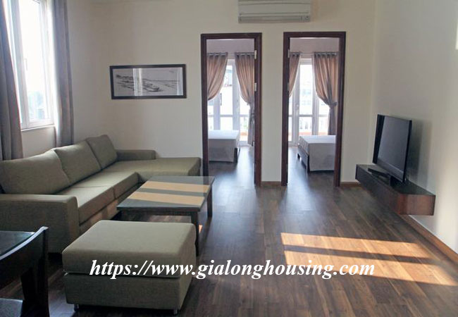 The apartment is fully furnished and serviced, 75 sq m, composed of a living room combined with dining room, functioning kitchen, it has wooden floor, two-way air-cons, 02 bedrooms and 02 bathrooms . Well managed building with elevator, 24h security guard, include Internet wifi, TV cable, Water