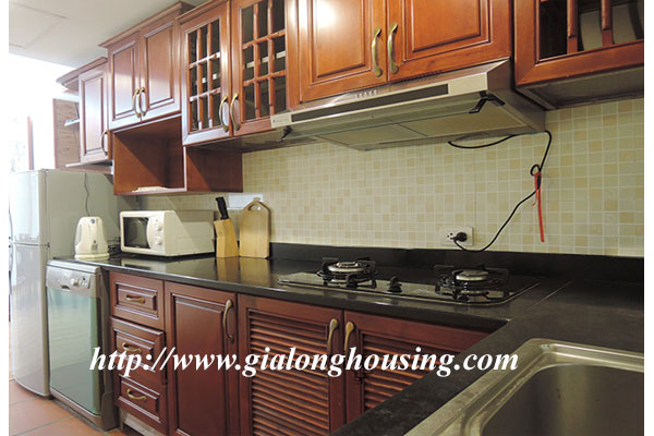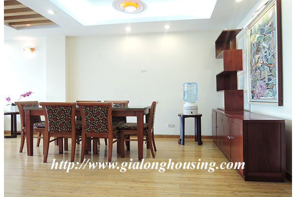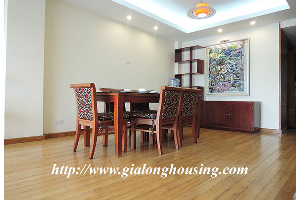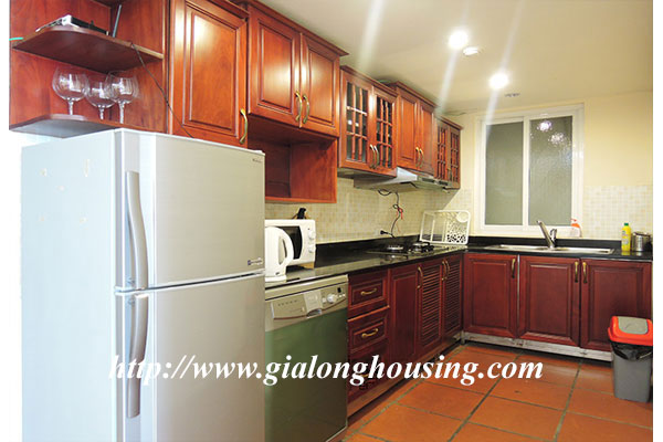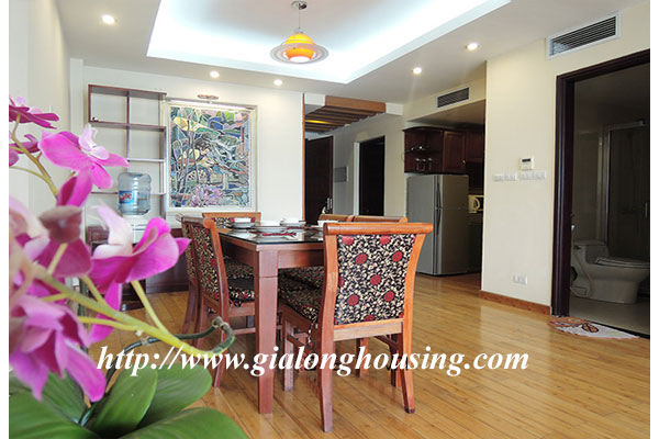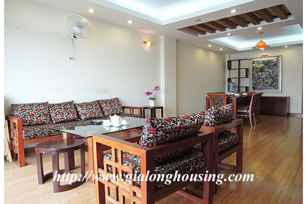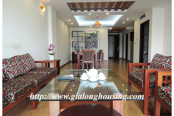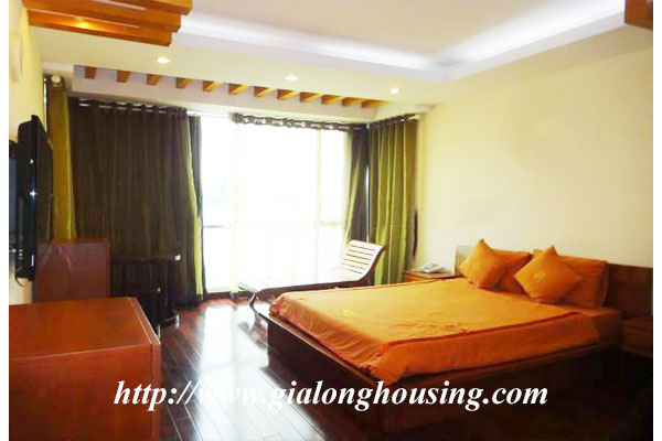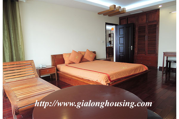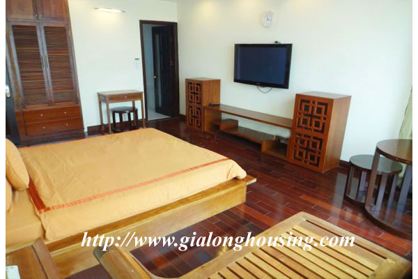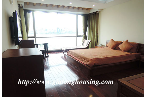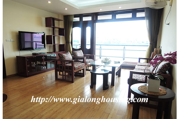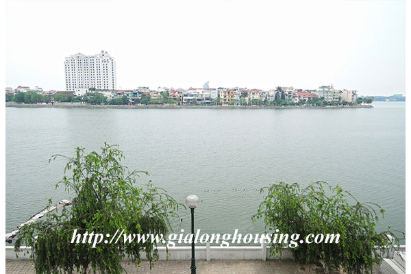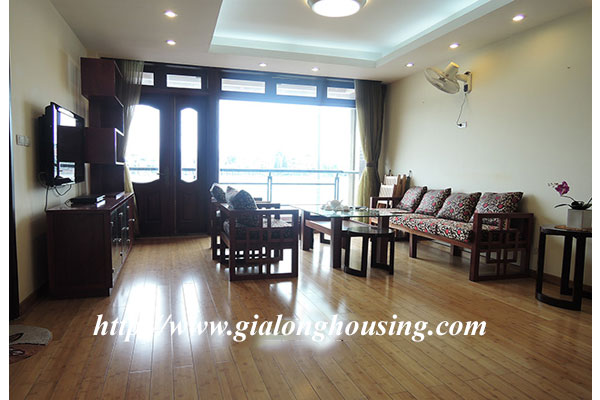 This is a serviced apartment in Quang An street. The location is very good, close to Xuan Dieu street, Sheraton hotel, Fraser Suites, Fivimart supermarket. The total area is 110 sq m with 02 bedrooms and 02 bathrooms. All rooms are nice and bright with the paranormal view of West lake. All furniture are new and comfortable for tenants to live in both long and short term.