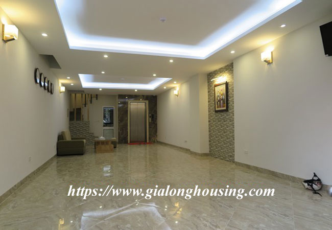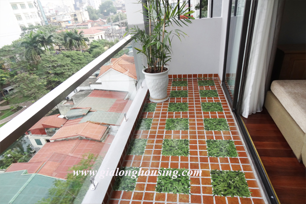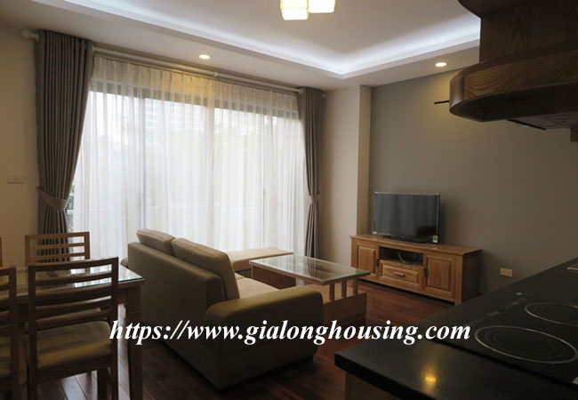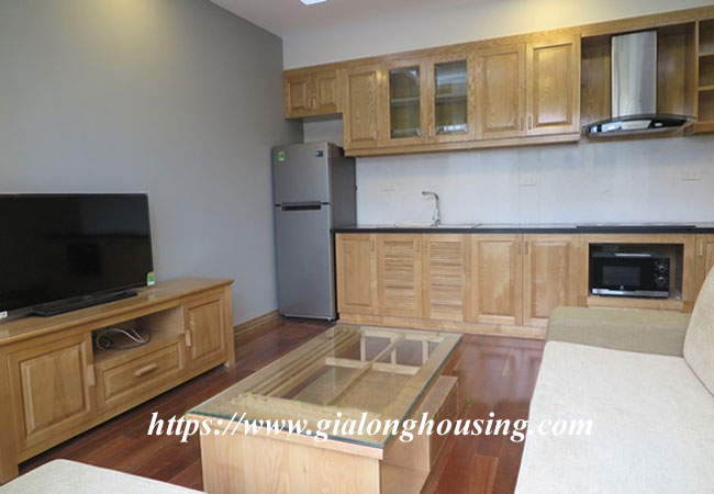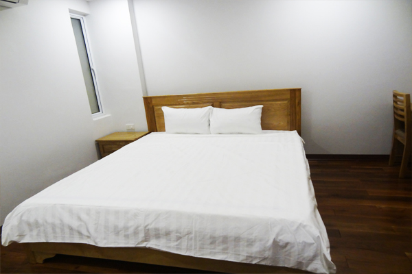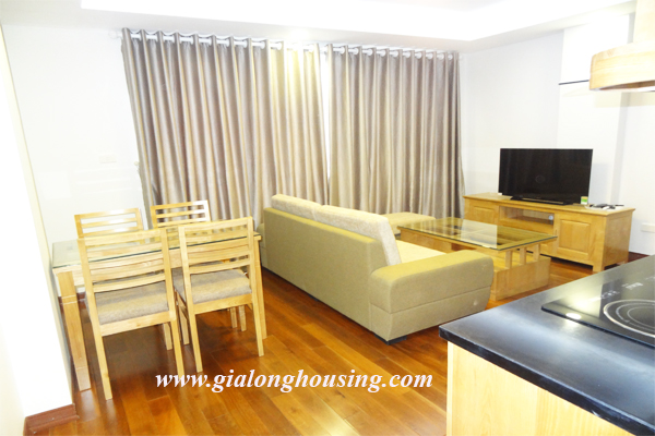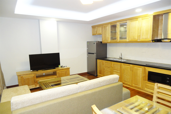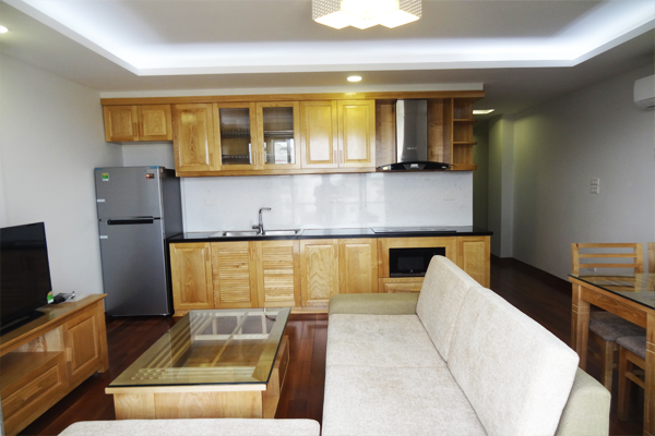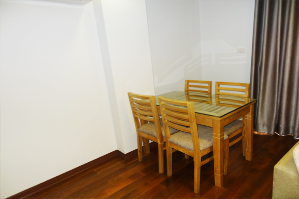 Apartment for rent is located in Truc Bach area, in a quiet street near Truc Back Lake. It is 70 m2 in size, has 1 bedroom, 1 bathroom, living room and kitchen. Everything is brand-new including furniture and electric equipment. It features wooden flooring, nice bathroom, and well-equipped kitchen.Rental apartment is in a building with 24-hour security guard, elevator and parking space. It is within easy walk to plenty of cafes, restaurants and shops nearby.