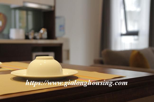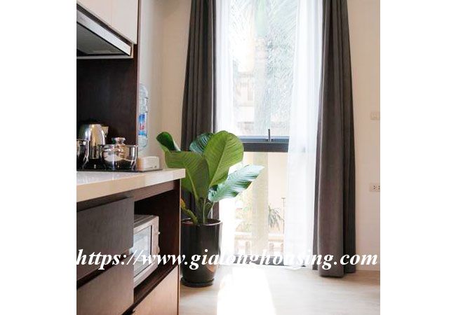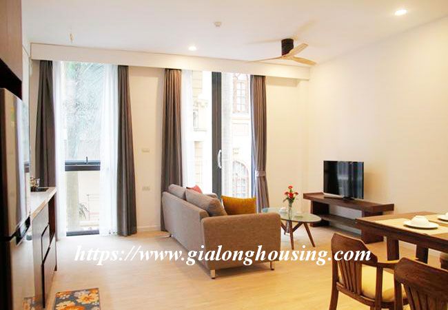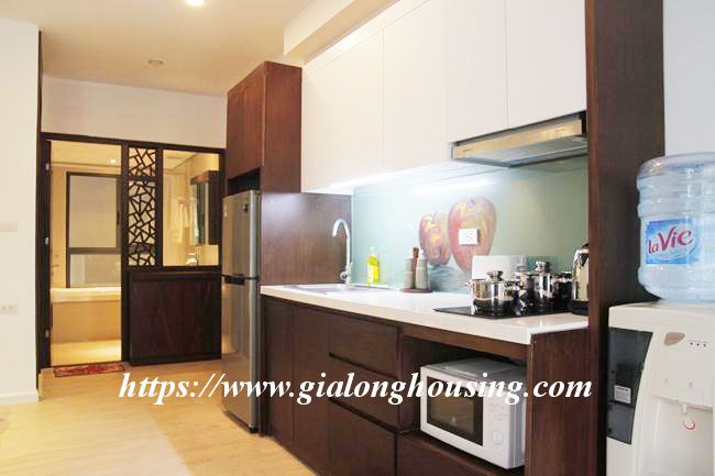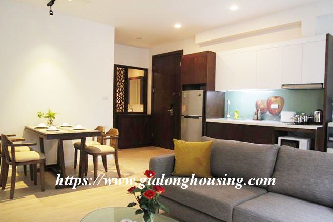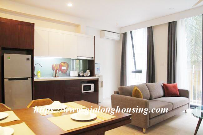 This brand new serviced apartment is located in Kim Ma, between Ngoc Khanh lake and Thu Le park, walking distance to Daewoo Hotel, Australian embassy and Lotte tower. The total area is 46 sqm, including 01 bedroom and 01 bathroom. The rent includes: tap water, high speed internet, cable TV and cleaning service 03 times/week.