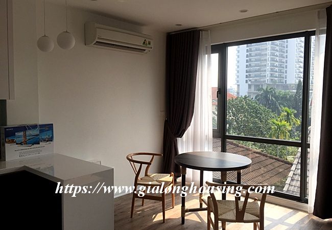 This brand new serviced apartment is located in To Ngoc Van lane, not far from West lake and Fraser Suites. The total area is 80 sq m, including 01 bedroom and 01 bathroom, suitable for long term contract. The rent includes: cable TV and wireless internet. The apartment is full of sunlight and fresh air.