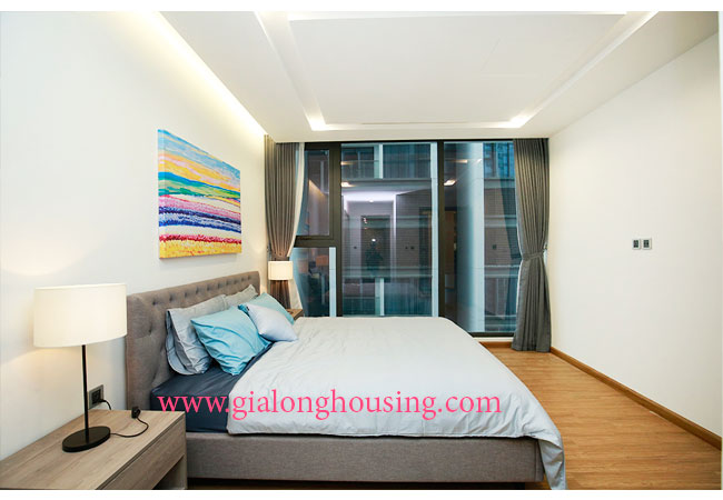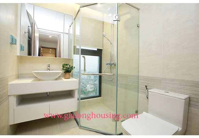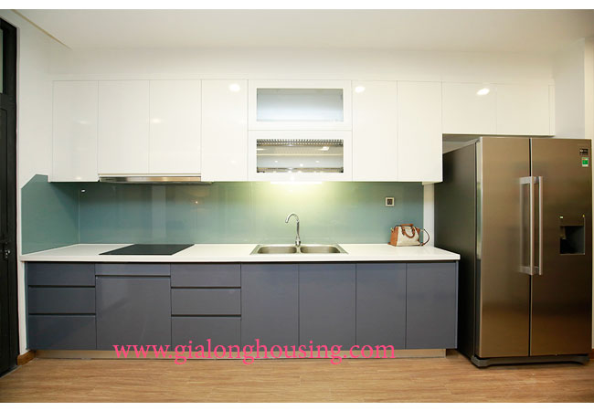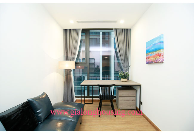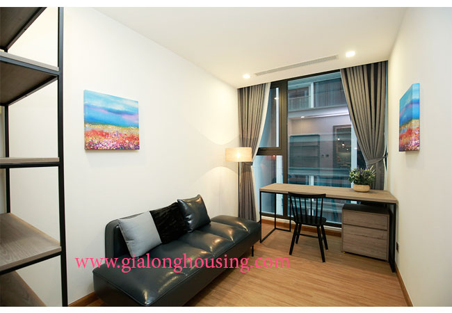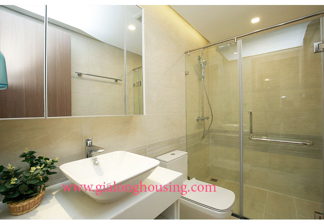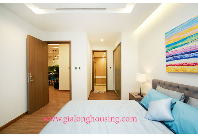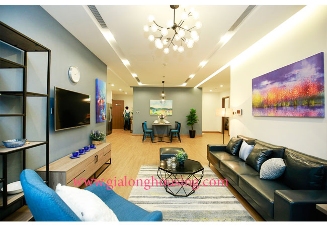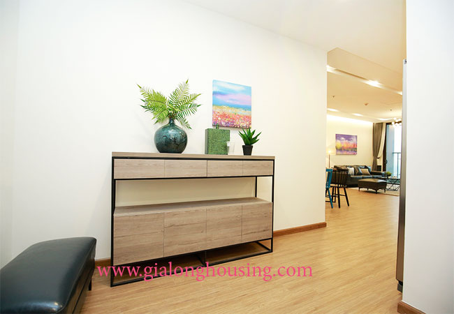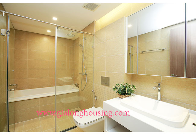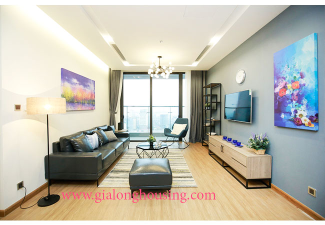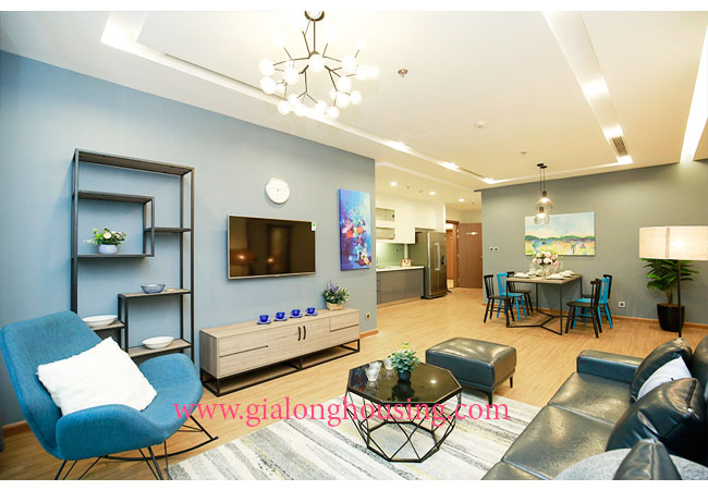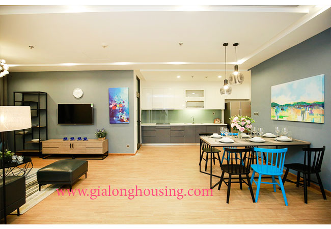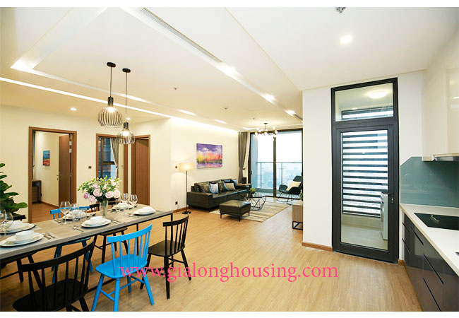 This bright apartment with 03 bedrooms for rent in Vinhomes Metropolis is well designed with a spacious area of 145 sqm, a large living room, an open kitchen combined with dining area, 02 bathrooms. It’s fully furnished, fully covered with wooden floor.The living room of this apartment is modern with an L-shape sofa, an ideal corner for a family to stay together after dinner. The kitchen is provided with full cooking accessories. It has an additional table which widens space for cooking and food preparation. The dining area is designed for a family with 06 seats.