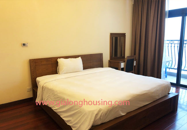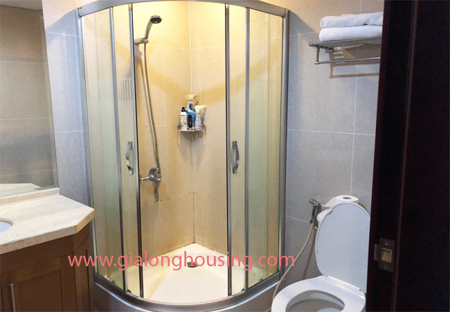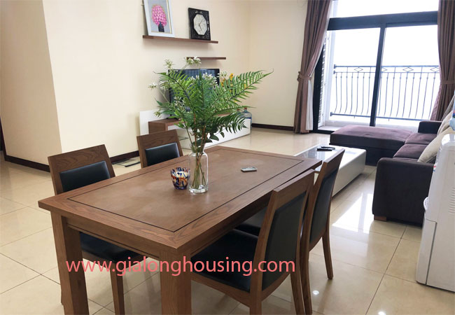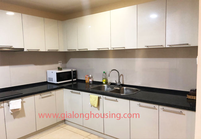 This 03 bedrooms apartment on high floor in Royal City for rent with area of 131 sqm. The furnished apartment is well designed floor plan with a spacious bright and airy sitting-room. it was decorated very nice with carpet, big sofa, tea table, wall murals, flower vase, chandelier, TV, TV cabinet, curtains... and modern kitchen equipped. It has three bedrooms and 2 bathroom includes shower and tub as well. In dining area is arranged dining table and chairs. In the bedrooms were designed and decorated with nice style bedding.