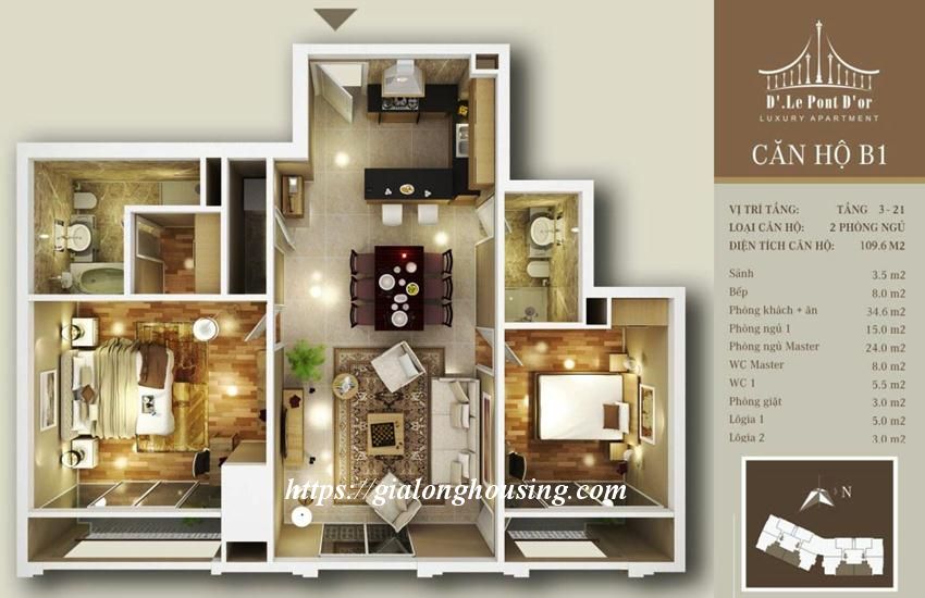 D'le Pont D'Or 36 Hoang Cau is a full services complex with shopping mall, banks, offices, restaurants, cafes, parking lot and residential area. All the building has security, elevator, gym and other facilities that meet your demand. The apartment has 2 bedrooms and 02 bathroom in 106 sq m of the total area. The whole apartment are bright and nice with full of amenities.