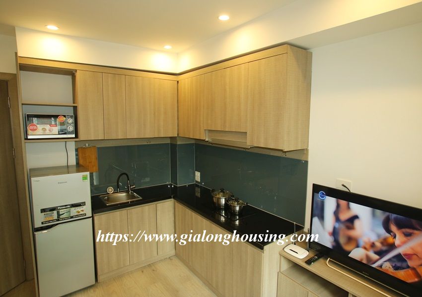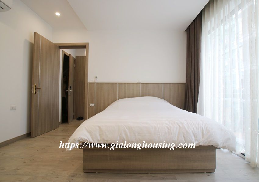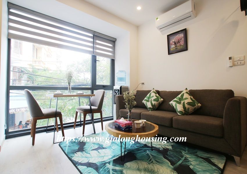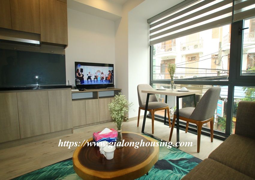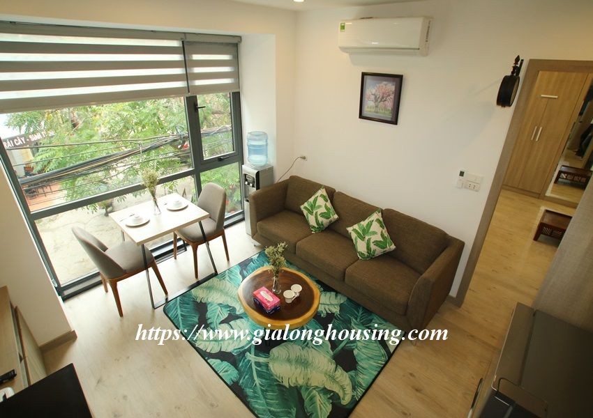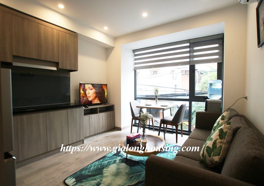 This is one fully furnished bedroom apartment for rent in Hoang Quoc Viet. It is very new with modern and beautiful furniture. All the rooms are bright with large glass windows. The total area is 55 sq m. The rent includes: high speed internet, tap water and cable TV.
