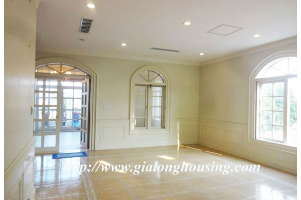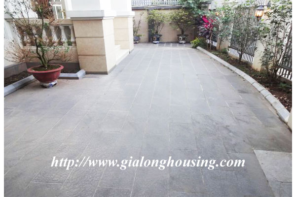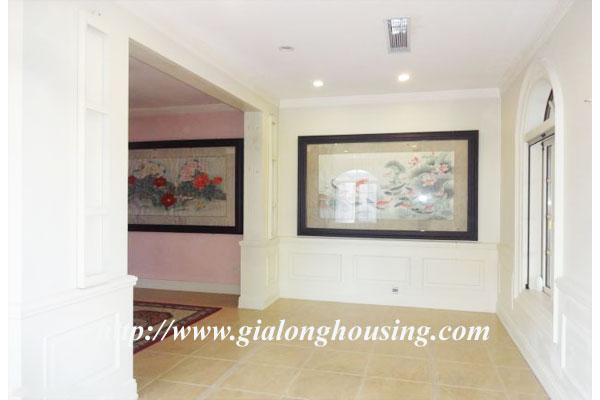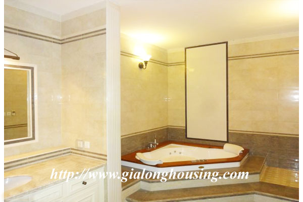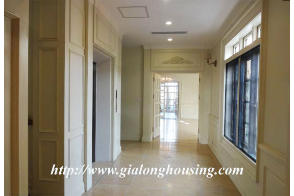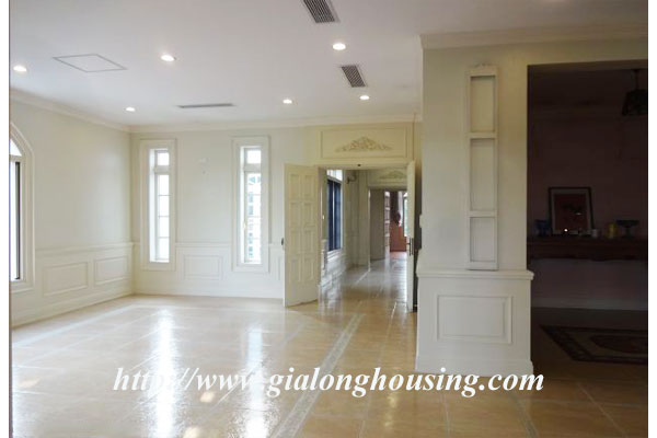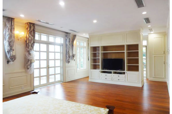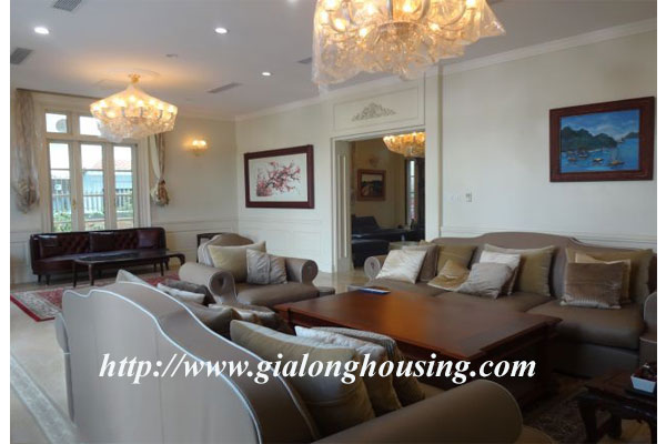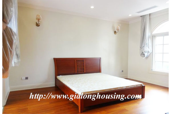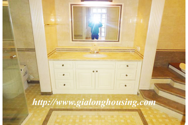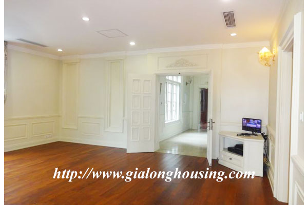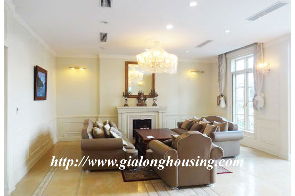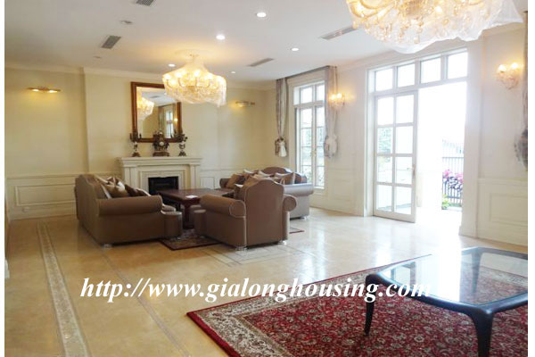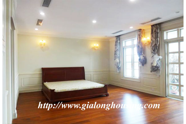 Luxury 5 bedroom villa for rent is located in Nghi Tam, Tay Ho, Hanoi. The land area is 500 sq m and the construction area is up to 200 sq m with 3.5 floors. The villa was designed with the inspiration of European Royal architecture style including 5 modern bedrooms, 5 bathrooms with showers and bathtubs, 2 spacious and luxurious living rooms, a comfortable dining room, and a charming kitchen with full utensils. All rooms are bright and airy due to lots of glass windows and green trees in the outside small courtyard. Spacious terrace can be used for BBQ party. It is suitable for big family with kids. Fully furnished with modern and charming furniture, wooden flooring. Price: $5500