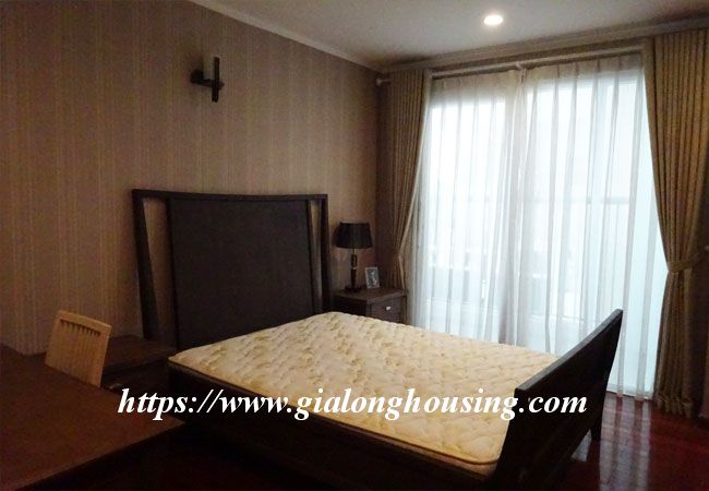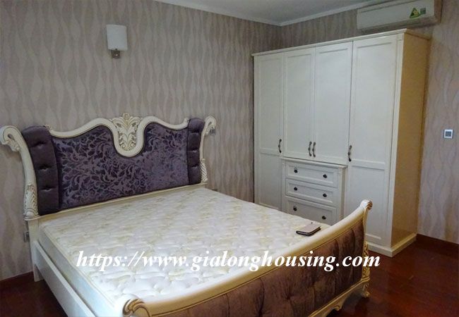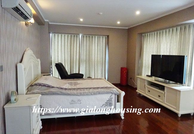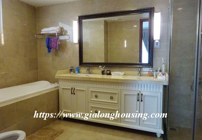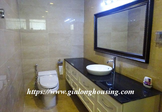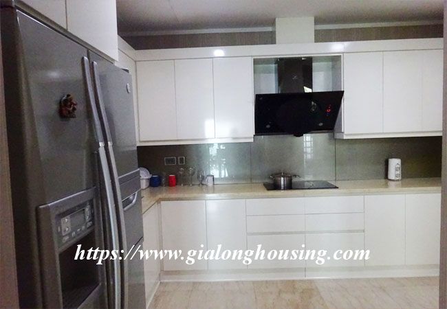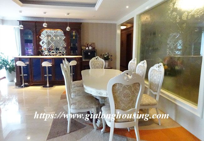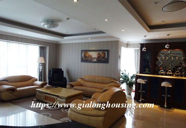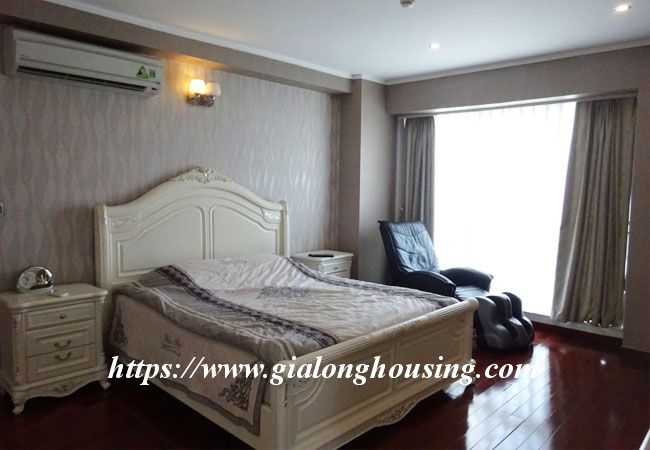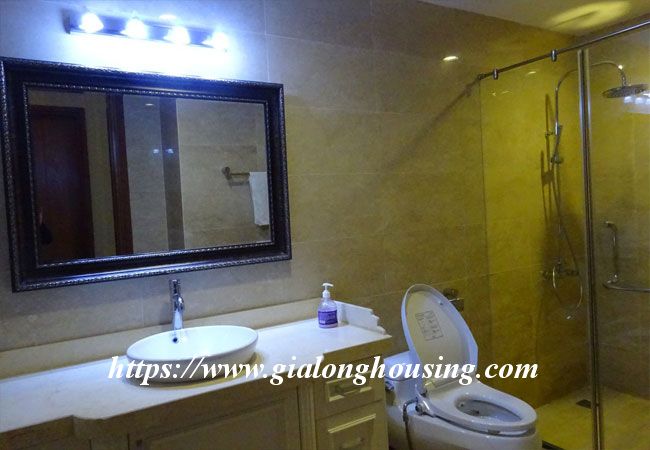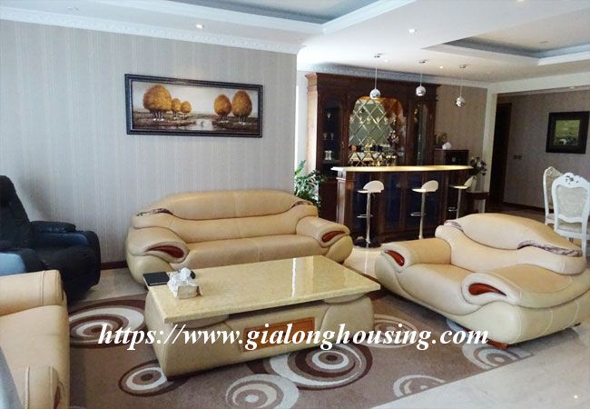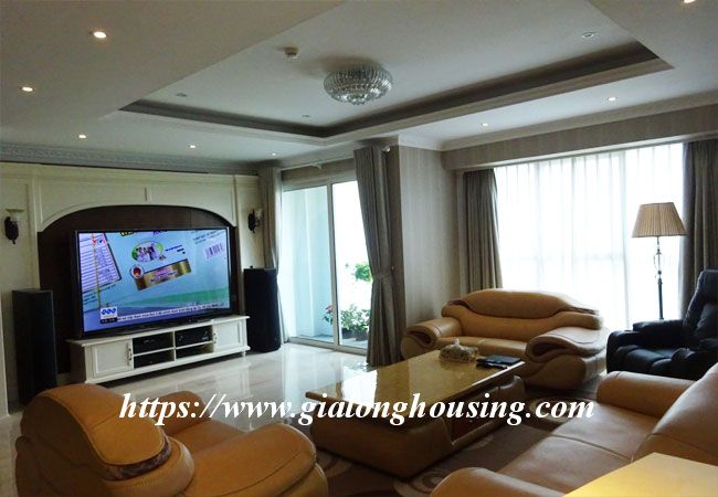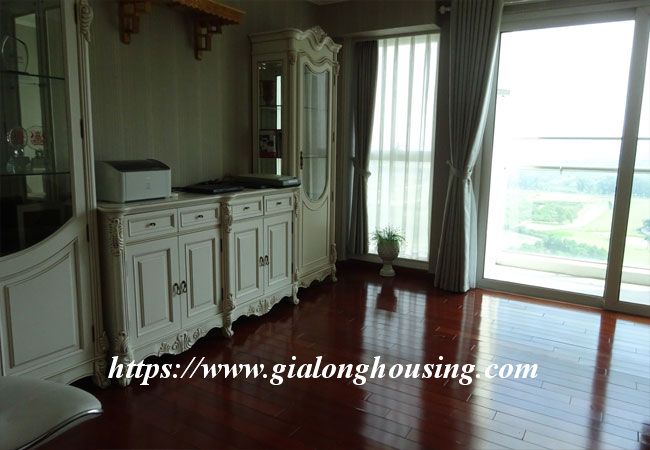 This beautiful apartment is located in high floor of L2 building, Ciputra urban area. The total area is 267 sq m, including 04 bedrooms and 03 big bathrooms. All the bedrooms have windows with great view of Ciputra golf court. The big living room is a good place to welcome visitors and gather all the family members. It is combined to a modern kitchen by a dining area. The furniture and equipment in the apartment are modern and Western design.