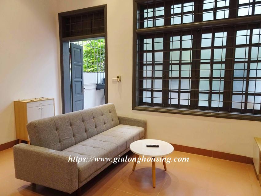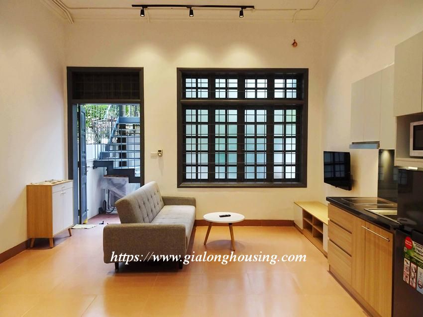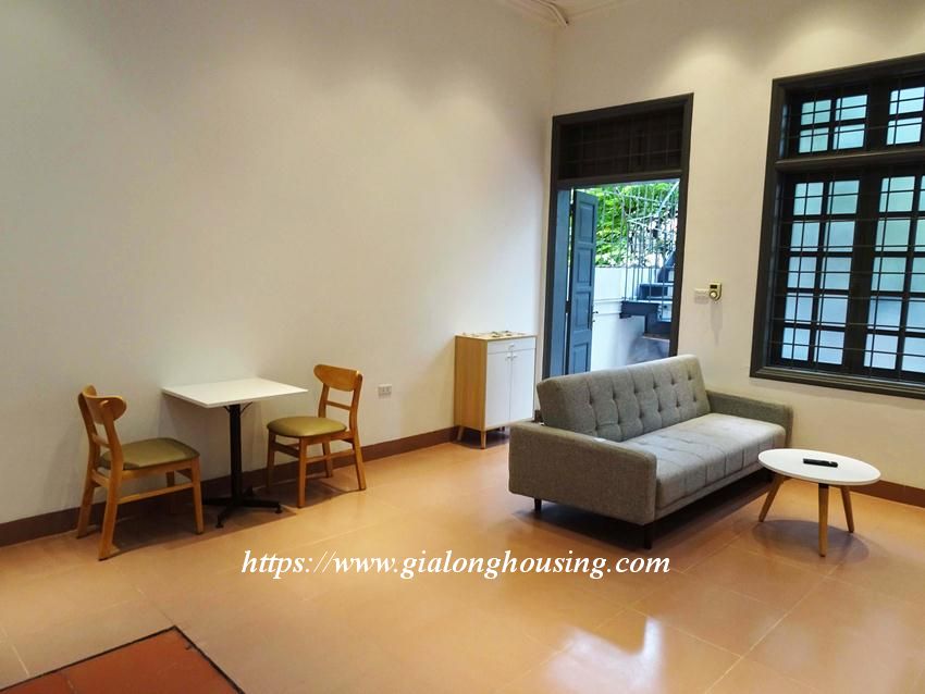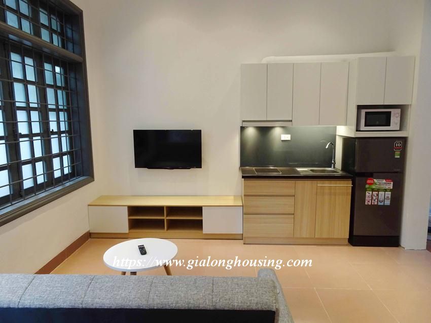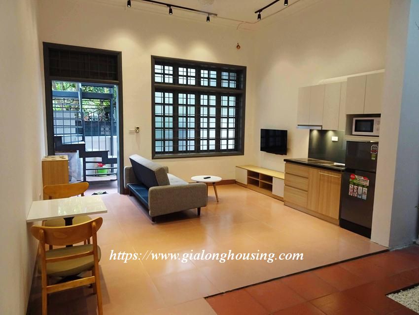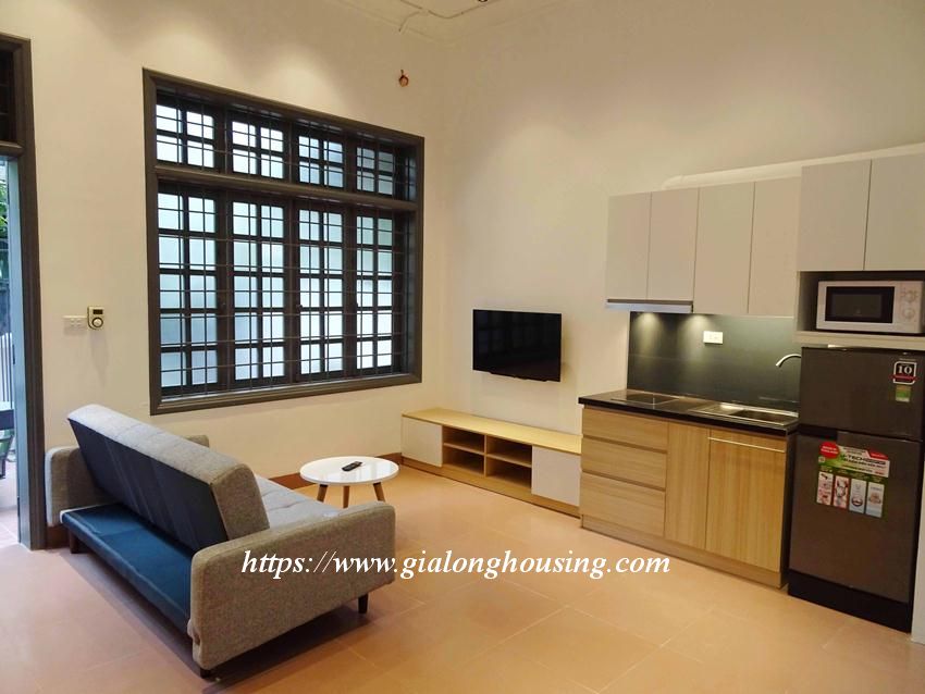 This brand new apartment is located in the 1st floor of a serviced building in Ngoc Ha. The total area is 50 sq m, 01 bedroom and 01 bathroom. Although it is located on the low floor, the apartment is bright due to the unique design. The rent includes: cable TV, wireless internet and tap water.