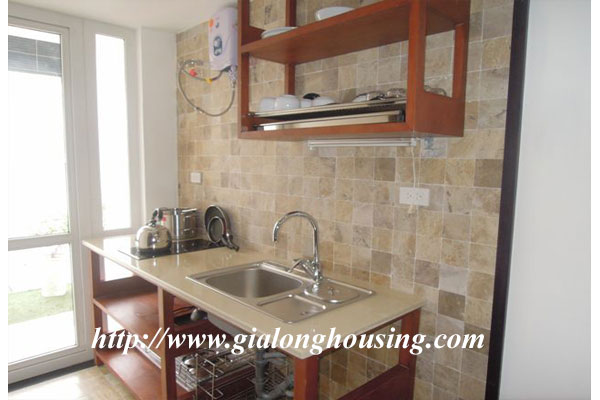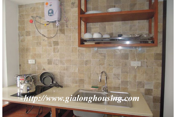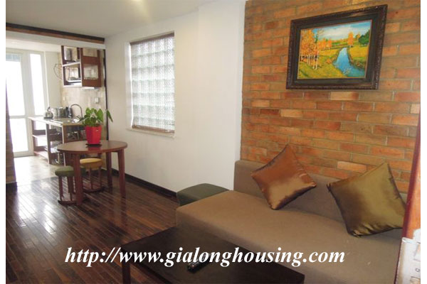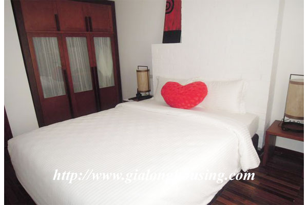 This is a small but cozy apartment in Dao Tan street, Ba Dinh district for rent. The total area is 45 sq m with 01 bedroom and 01 bathroom. All furniture are provided by the landlord. The building has services: wireless internet, cable TV, water, security. The location is very good, close to Lotte Tower, Australian Embassy, Japanese Embassy, restaurants, cafes.