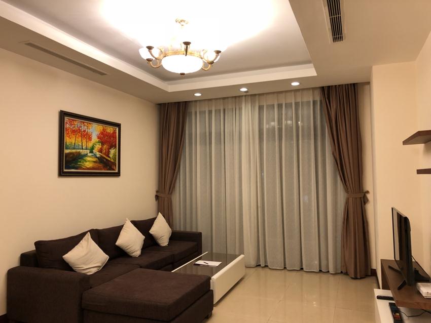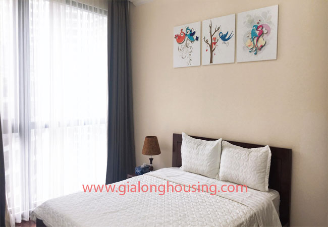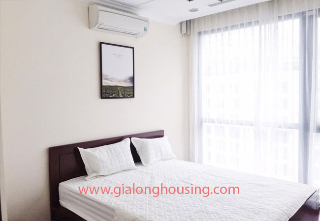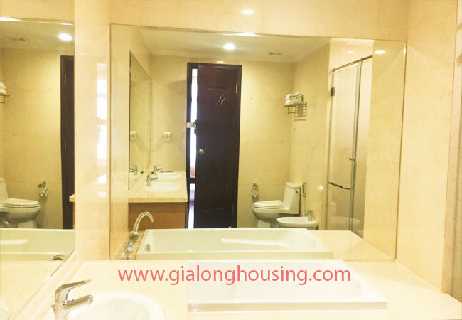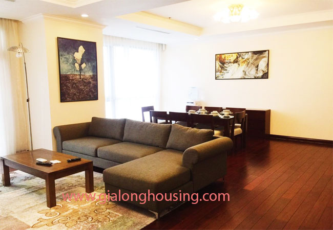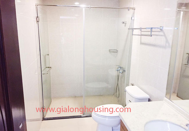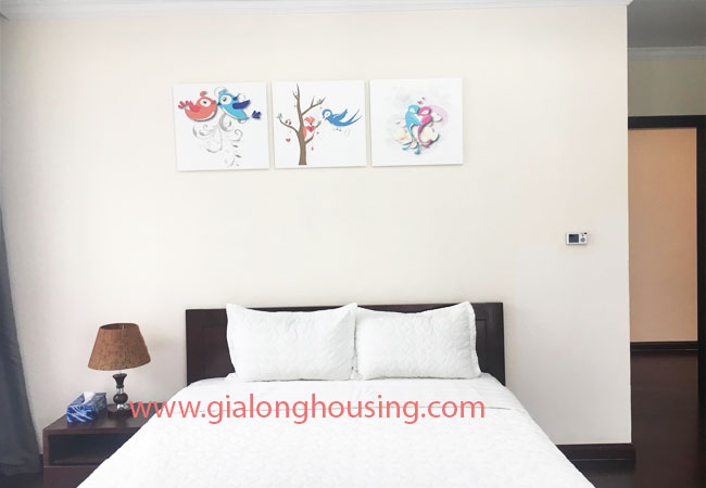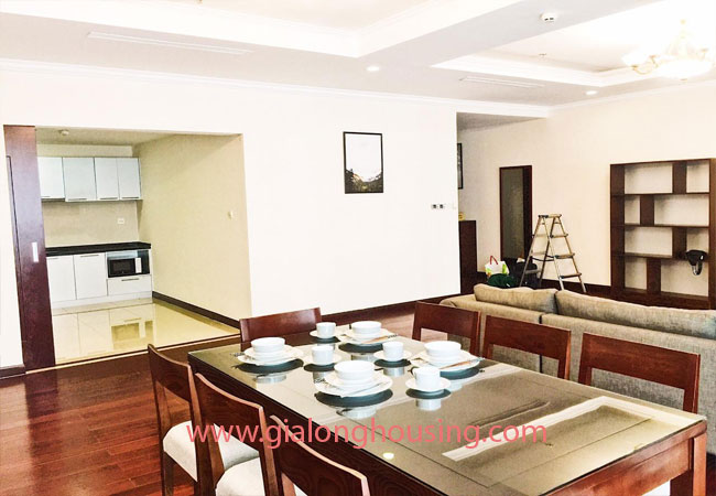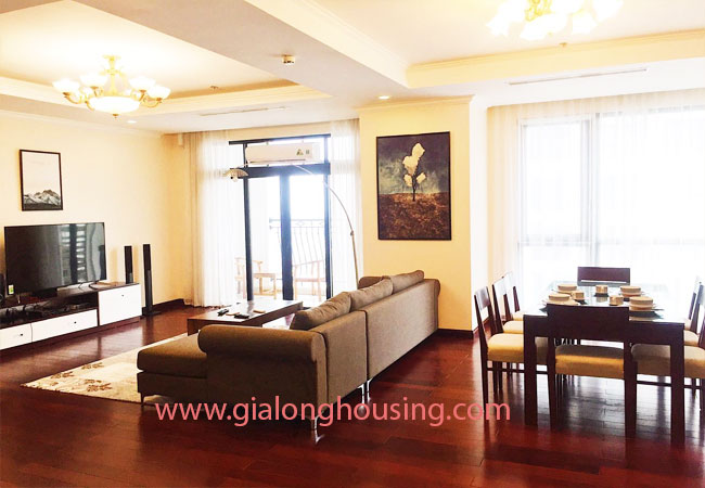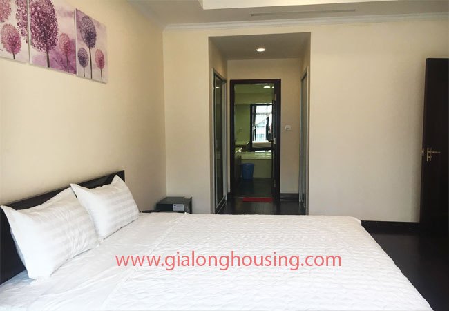 Total living area of this furnished apartment in Hanoi is 180m2, composed into 03 bedrooms, 03 bathrooms with modern toilet amenities, living room combined with dining area and an opened kitchen.