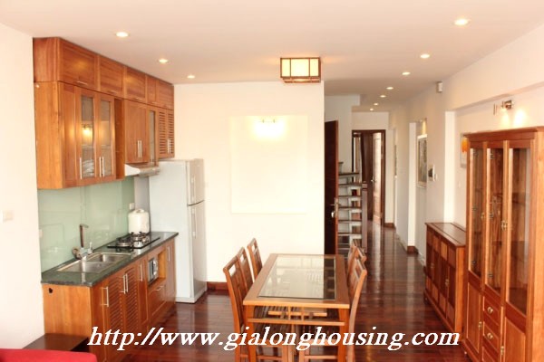 Penthouse apartment in Truc Bach area,ba Dinh district for rent, 160 m2 in size including 2 floors inside. Living room, kitchen and toilet are on the first floor. There are three bedrooms and 2 bathrooms on the second floor. The whole apartment is nicely furnished with modern furniture and equipment. Facing the Truc Bach Lake, it offers lots of natural light and great lake view from living room and bedrooms.