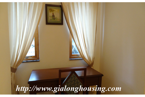Nice serviced apartment for rent in Han Thuyen Street near Opera House Hoan Kiem district. The total area: 100 sqm, composed of 02 nice bedrooms, 02 bathroom with bathtub, spacious living room. Modern furniture and fully furnished: TV, sofa, frigde, 2 ways air conditioners.... Security is good. The building has elevator and 24/24 security. Rental fee: 1000 USD/month (includes VAT, internet, cable TV, cleaning and washing serviced 3 times a week.)