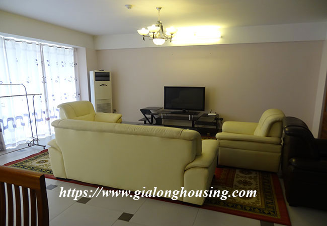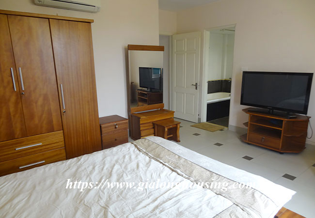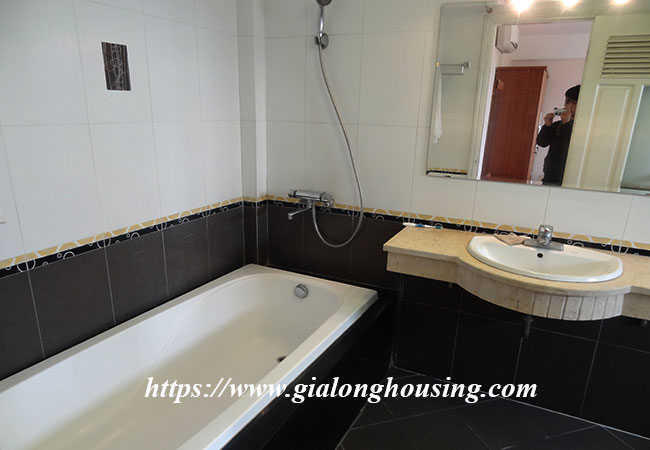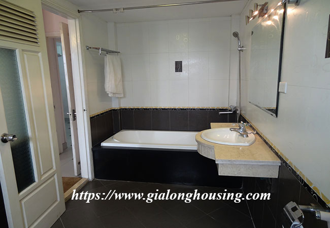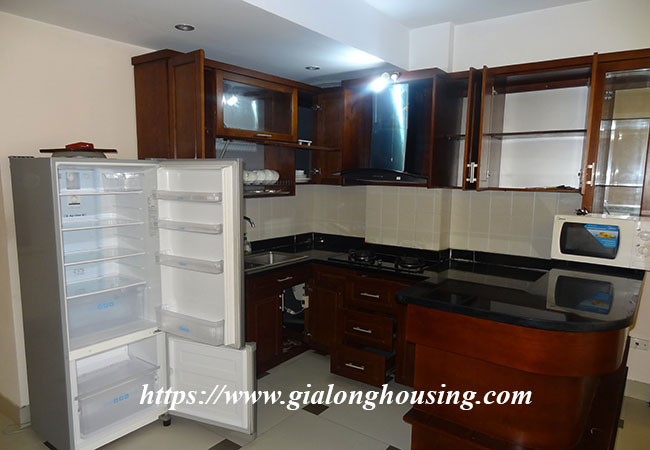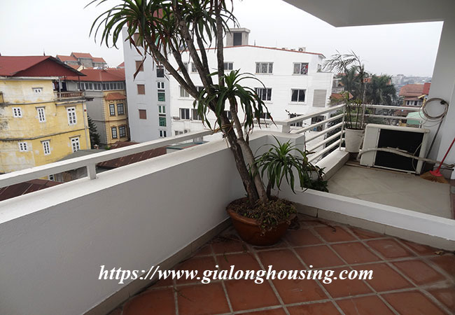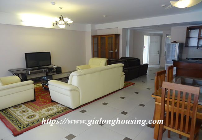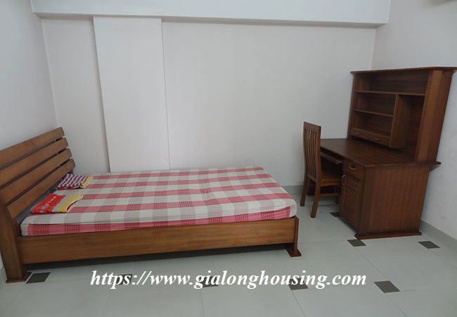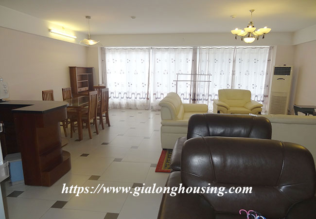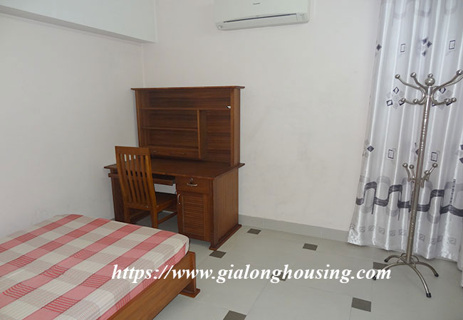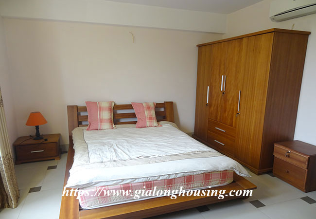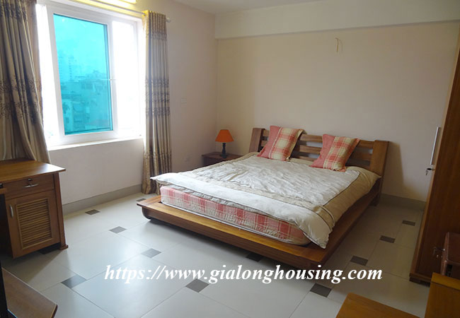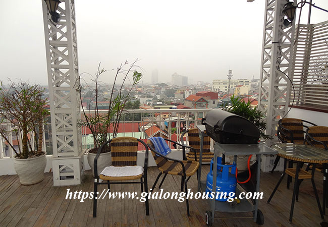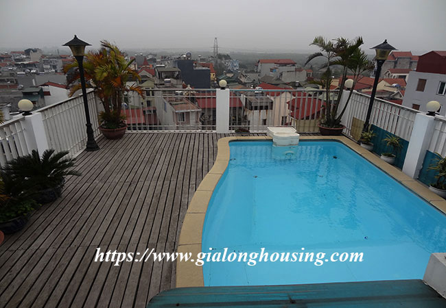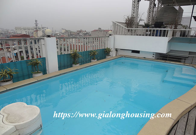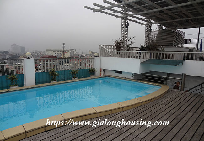 This apartment is located at Nghi Tam, Tay Ho district. The surrounding area is quiet and peaceful. The total area of this serviced apartment is 100 sq m with 02 bedrooms and 02 bathrooms. The whole apartment is bright and nice with a lot of natural light and cool wind. On the top floor, there is a small swimming pool and a place for BBQ, cafe.