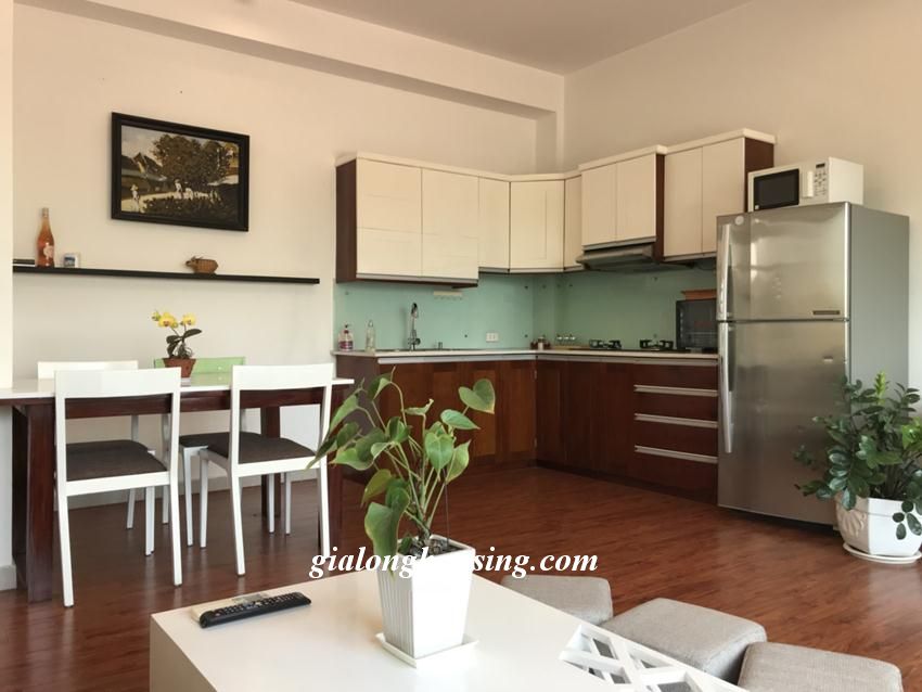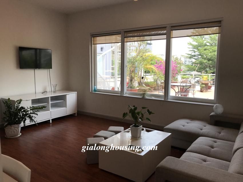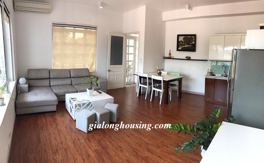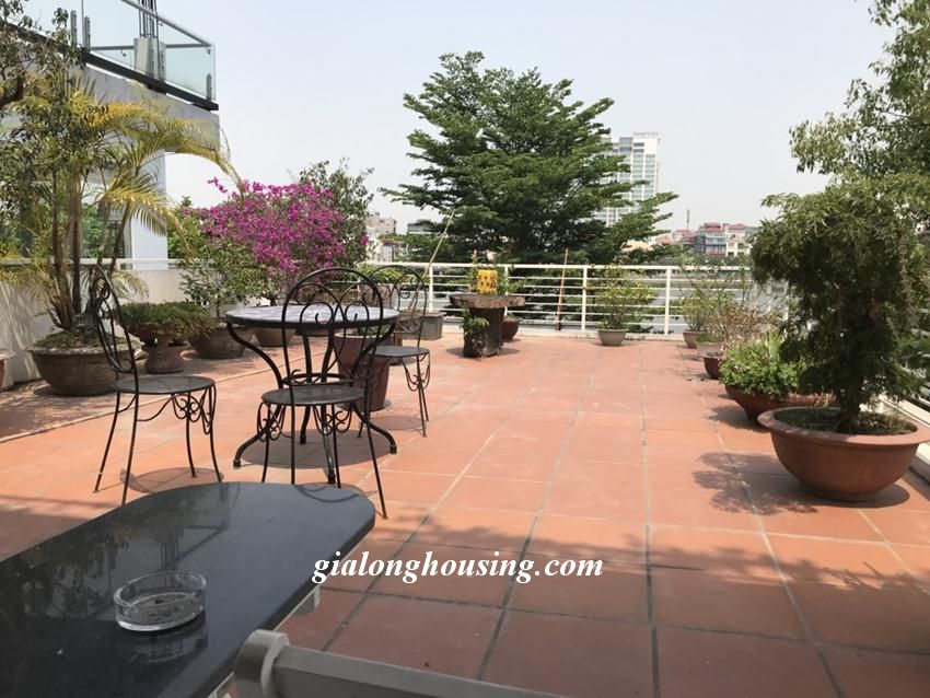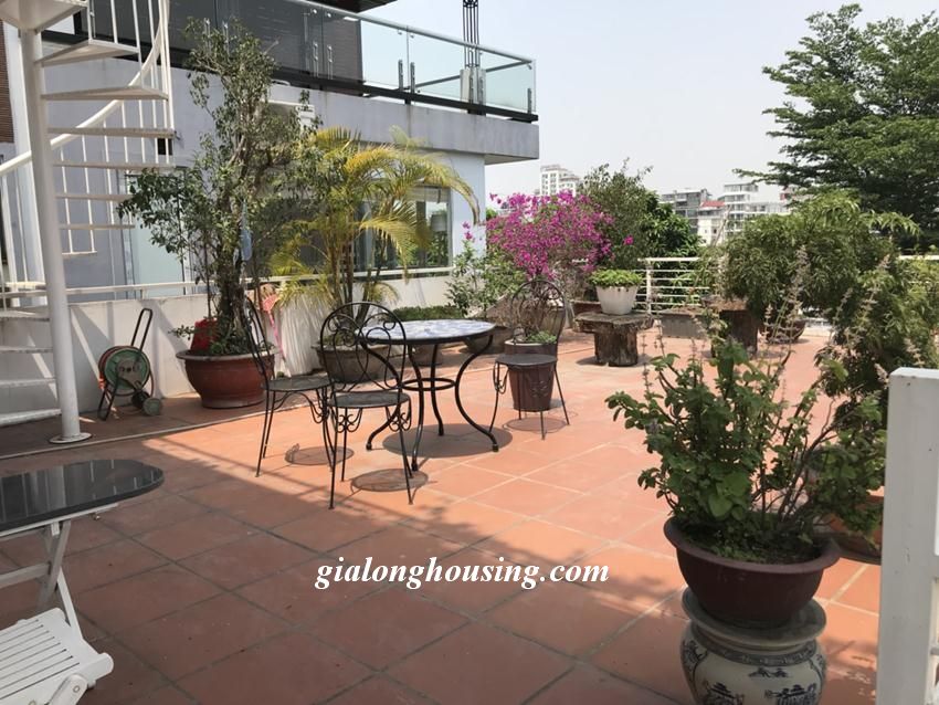 This nice apartment has a huge rooftop garden where you can sunbathe in the sunlight, relax in the summer time or enjoy the city view at night time. The total area is 120 sq m, 01 bedrooms and 02 bathrooms. The apartment is fully furnished and ready for the tenants to move in soon. The rent includes: cable TV, wireless internet and tap water.
