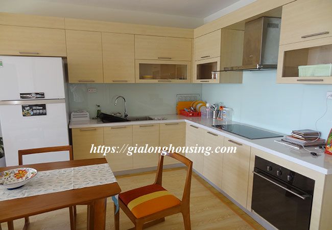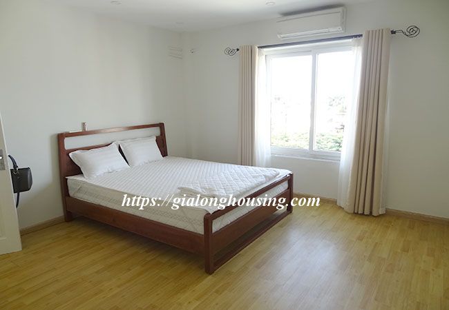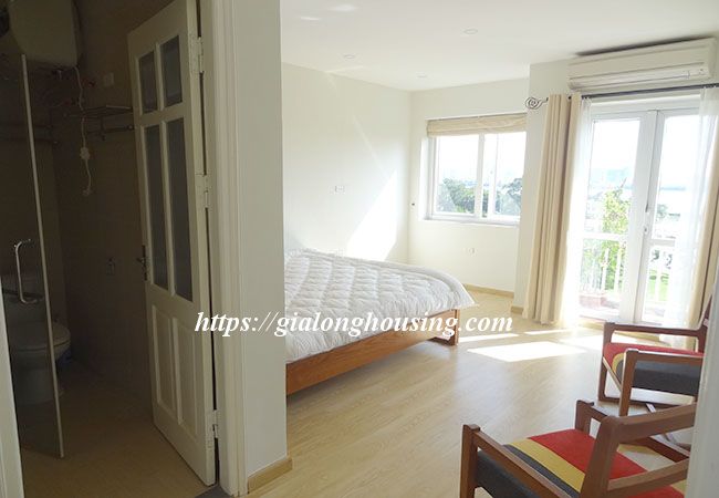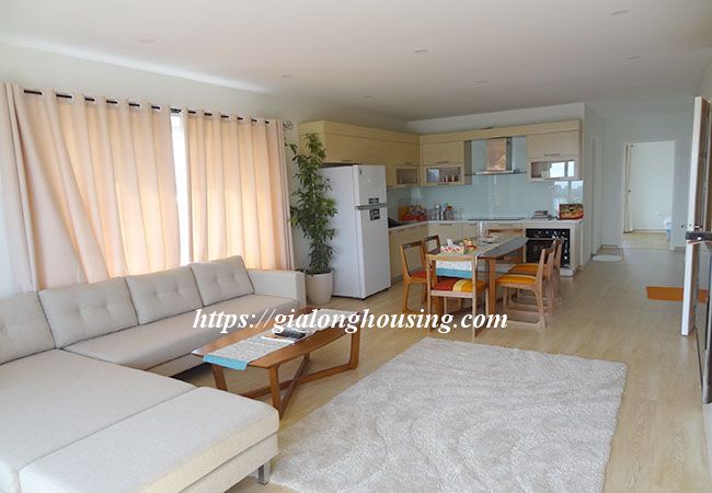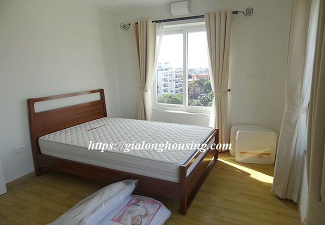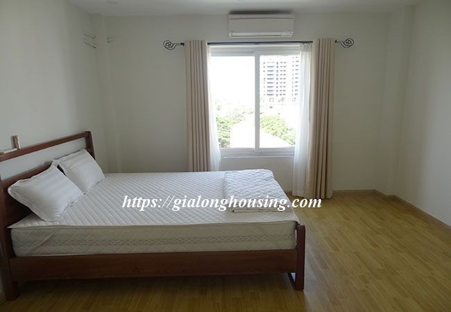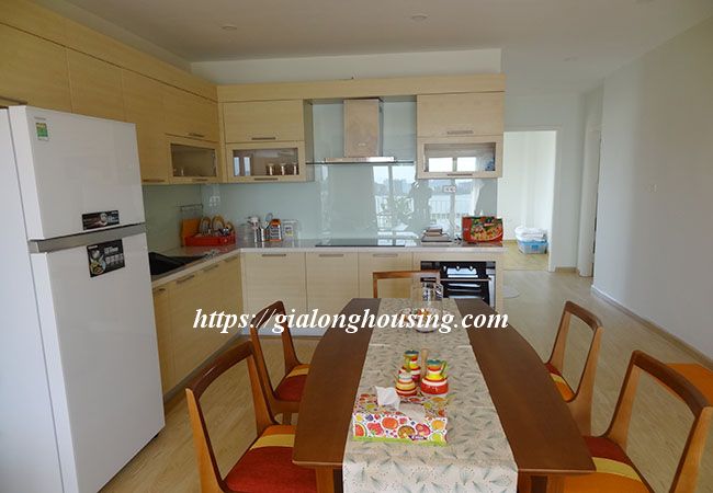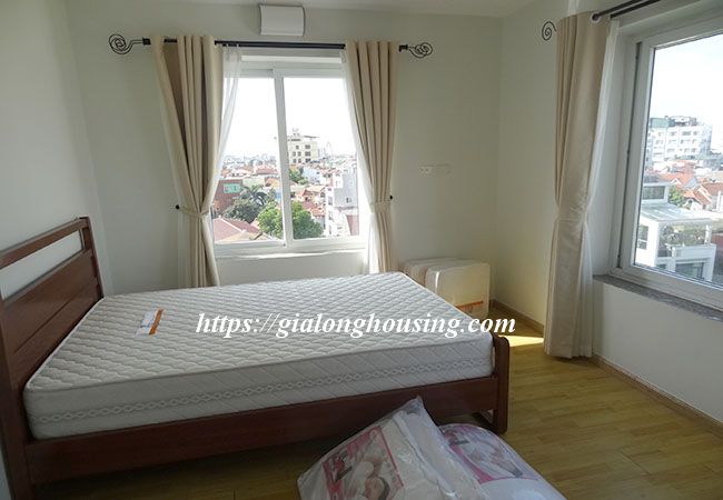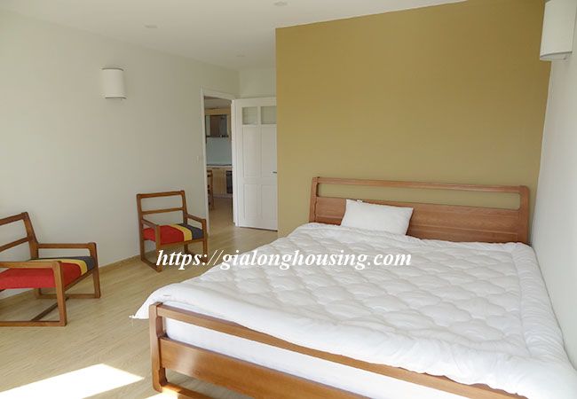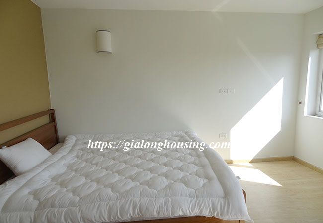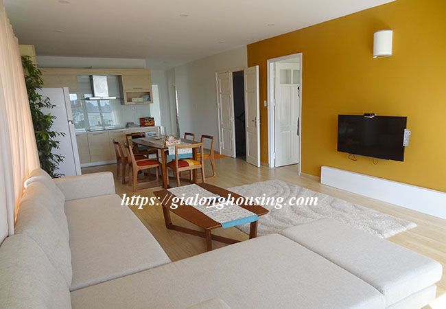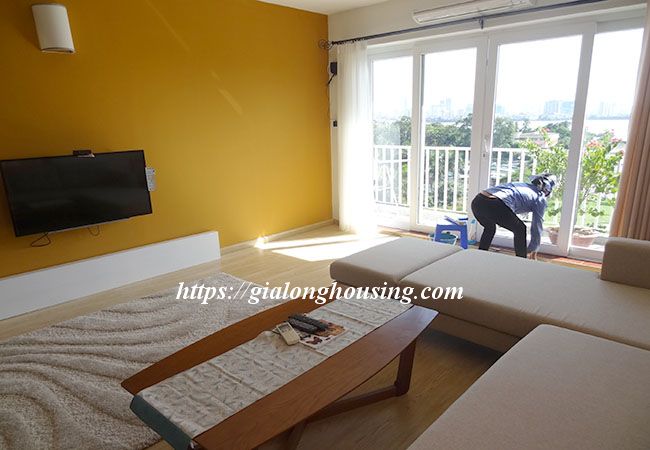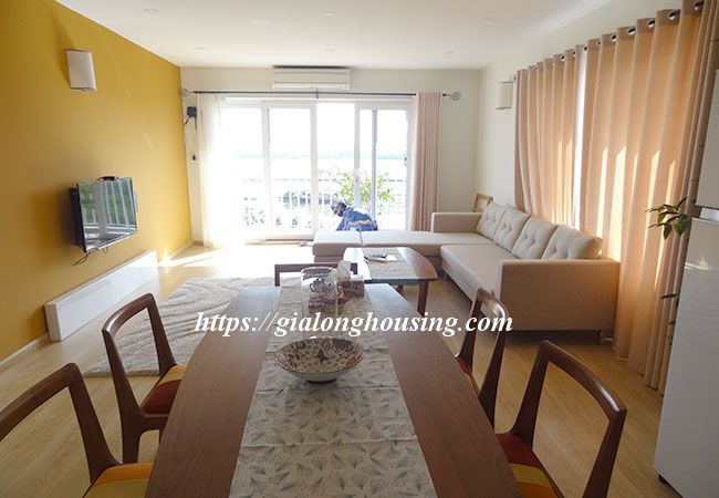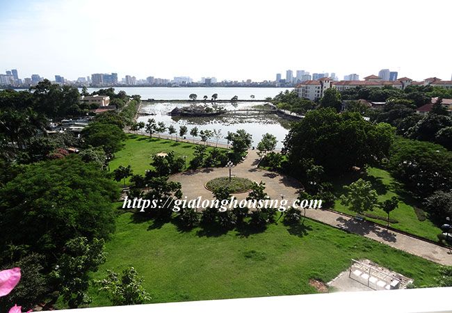 The total area is 140 sq m, including 03 bedrooms and 02 bathrooms. The whole apartment is full of natural light and fresh air from West lake. It is fully furnished and the tenants can move in immediately. The building has cleaning service and security.