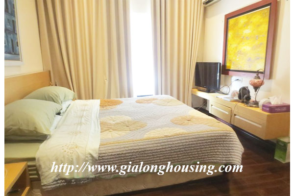 A wonderful house is located in Hoan Kiem centre, Ha Noi for rent. It has 02 bedrooms with a large balcony, big glass window, a nice terrace, a big living room,and a very modern kitchen. The first floor is a living room and a modern kitchen, a bathroom, second floor is a master bedroom and a big bathroom, third floor is a bedroom and bathroom. This house has wooden floor, high quality newly furnished, well-maintained, well decorated. The location is good, quiet and safe.