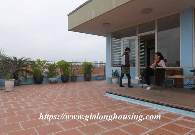 Tầng trên cùng là cho sân thượng, kích thước của nó là 80 m2. Nó có bàn ngoài trời và ghế. Có một phòng tắm với phòng xông hơi và bể sục. Một phòng lưu trữ và giặt xong sàn này.