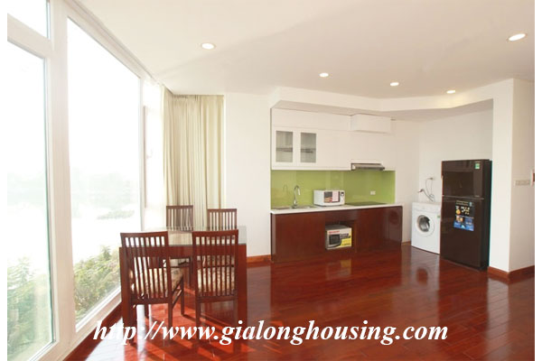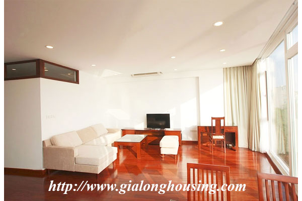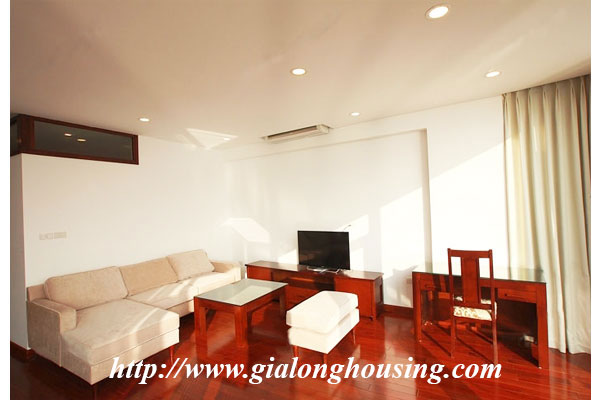 Căn hộ nằm ở phố Trúc Bạch, diện tích căn hộ 120m2, 2 phòng ngủ, 2 phòng tắm, căn hộ đầy đủ mọi nội thất hiện đại, toàn cảnh phòng khách căn hộ nhìn ra hồ Trúc Bạch, rất nhiều ánh sáng tự nhiên, không khí trong lành, an ninh đảm bảo, miễn phí sử dụng internet, truyền hình cáp, nước sinh hoạt.