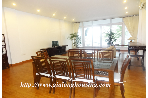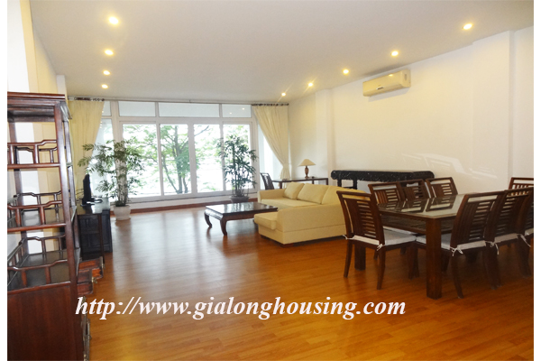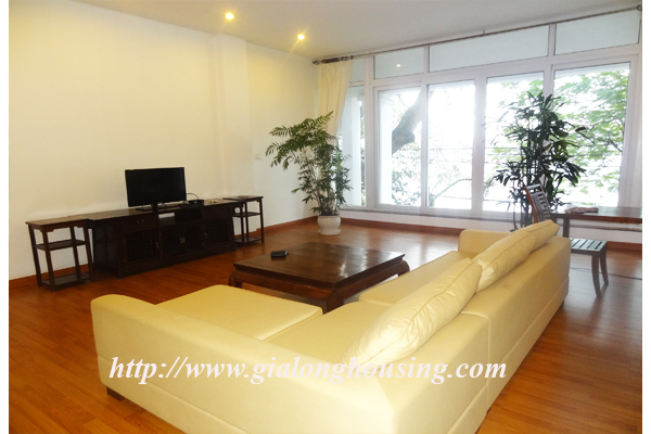 Cho thuê căn hộ dịch vụ cao cấp ở mặt hồ Trúc Bạch, diện tích căn hộ 150m2, 2 phòng ngủ, 2 phòng tắm, căn hộ có phòng khách rất rộng, toàn bộ phòng khách view nhìn thằng ra hồ, phòng bếp riêng biệt, nội thất hiện đại, căn hộ nằm ở trung tâm thành phố rất thuận tiện đi lại, không khí trong lành, an ninh rất tốt, miễn phí internet, truyền hình cáp, nước, dọn dẹp phòng.