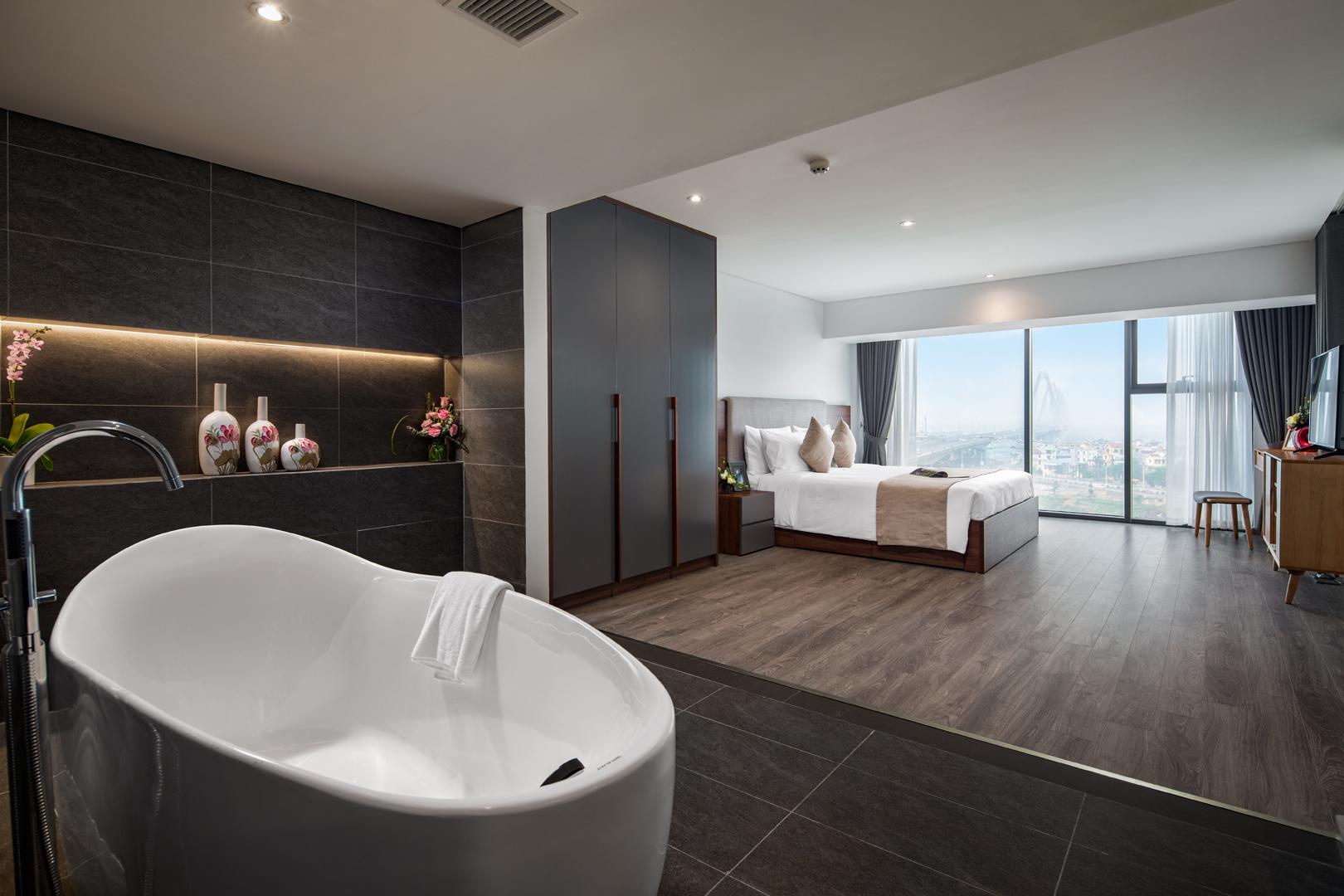 Căn hộ có diên tích 180m2, thiết kế 2 phòng ngủ, 3 phòng tắm, phòng khách mở, có view toàn cảnh hồ Tây, cầu Nhật Tân, Sông Hông và thành phố.