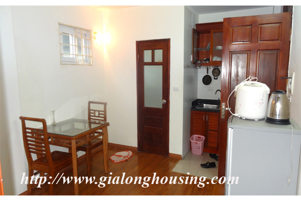 Cho thuê căn hộ dịch vụ, đầy đủ nội thất, tòa nhà có thang máy. trên phố Láng Hạ. Diện tích 40 m2, thiết kế 1 phòng ngủ riêng biêt, bếp, 1 vệ sinh, có bồn tắm, sàn gỗ. Giá thuê đã bao gồm các dịch vụ: net, cap, nước, dọn vệ sinh.
